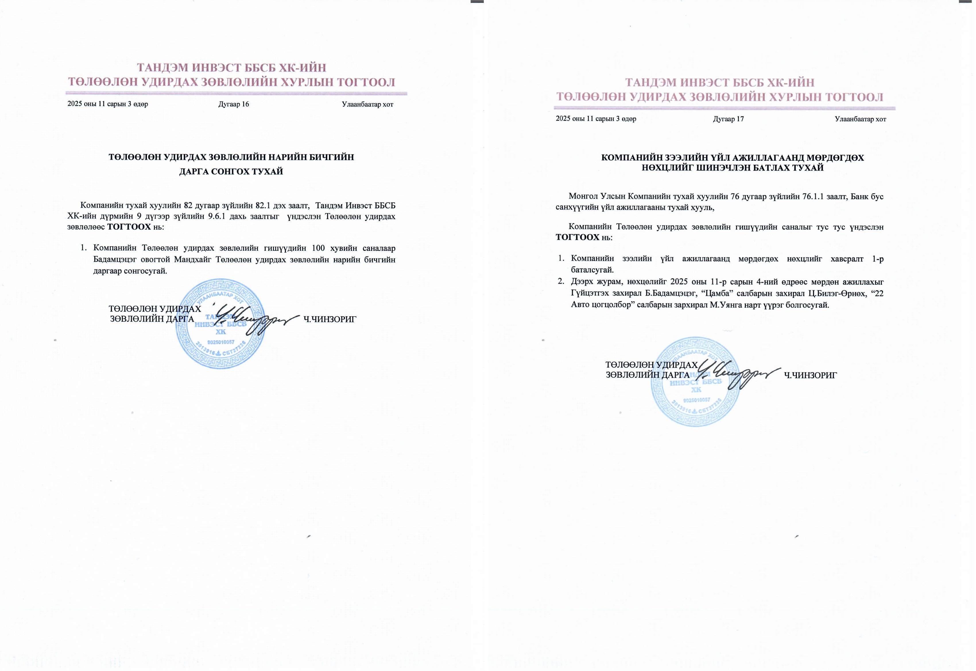 | 2 | Тандэм инвэст ББСБ ХК | TAND | ТУЗ-ийн хурлын шийдвэр | харах | 2025-11-06 |
