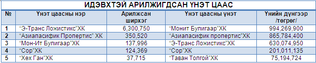 Нийт 51 хувьцаат компанийн 7,627,891 ширхэг хувьцааг 4.1 тэрбум төгрөгөөр арилжсан ба багцын арилжаагаар нийт 6.9 сая ширхэг хувьцааг 2.7 тэрбум төгрөгөөр арилжсан нь нийт хувьцааны арилжааны үнийн дүнгийн 65.9 хувь байна.