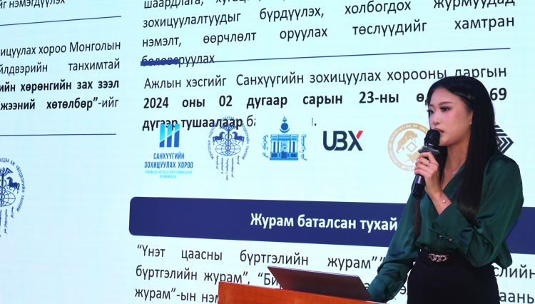 Санхүүгийн зохицуулах хорооны Үнэт цаасны газрын ахлах мэргэжилтэн Б.Энхтуул “Үнэт цаасны зах зээлийн эрх зүйн зохицуулалтын өөрчлөлт, хөнгөлөлт чөлөөлөлт” сэдвээр мэдээлэл хүргэсэн бол “Монголын хөрөнгийн бирж” ХК-ийн Бүртгэлийн албаны ахлах мэргэжилтэн М.Энхтуяа “Биржийн бүртгэлийн үйл явц, шалгуур шаардлага, хөнгөлөлт чөлөөлөлт”-ийн талаар дэлгэрэнгүй мэдээлэл, зөвлөгөө өгсөн юм.